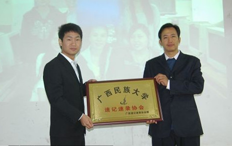2011年12月3日上午,广西速记速录协会学校部首届年会在广西民族大学举行,同时,广西速记速录协会总会向民大速记速录协会授牌。广西速记速录协会会长范俭出席仪式并致辞。